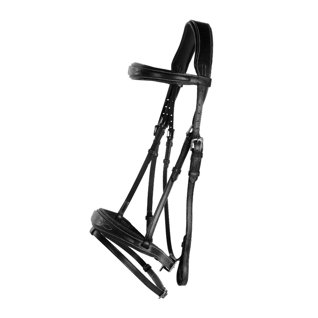 - Fodrad nosgrimma och pannband med dekorativa stickningar.