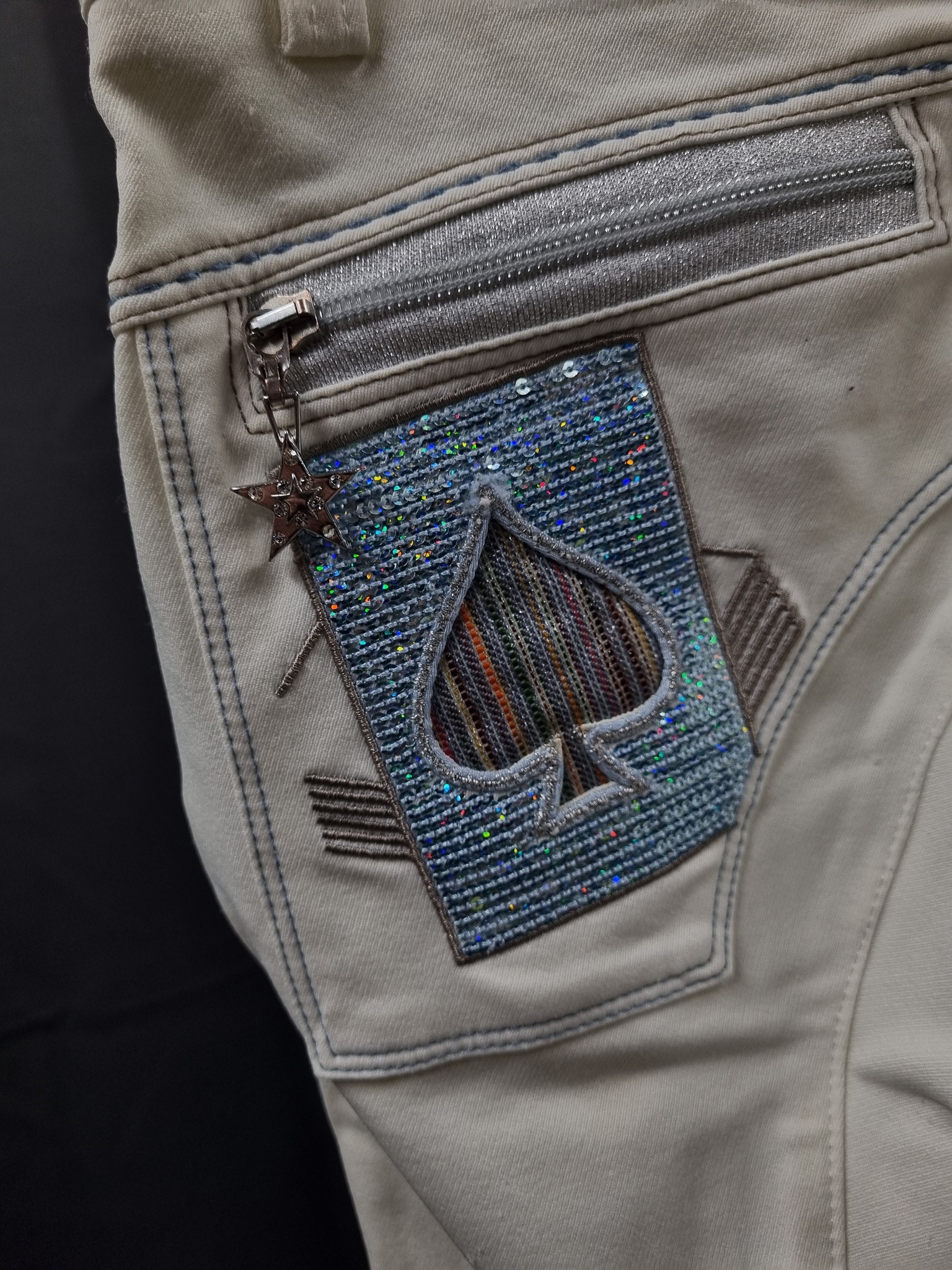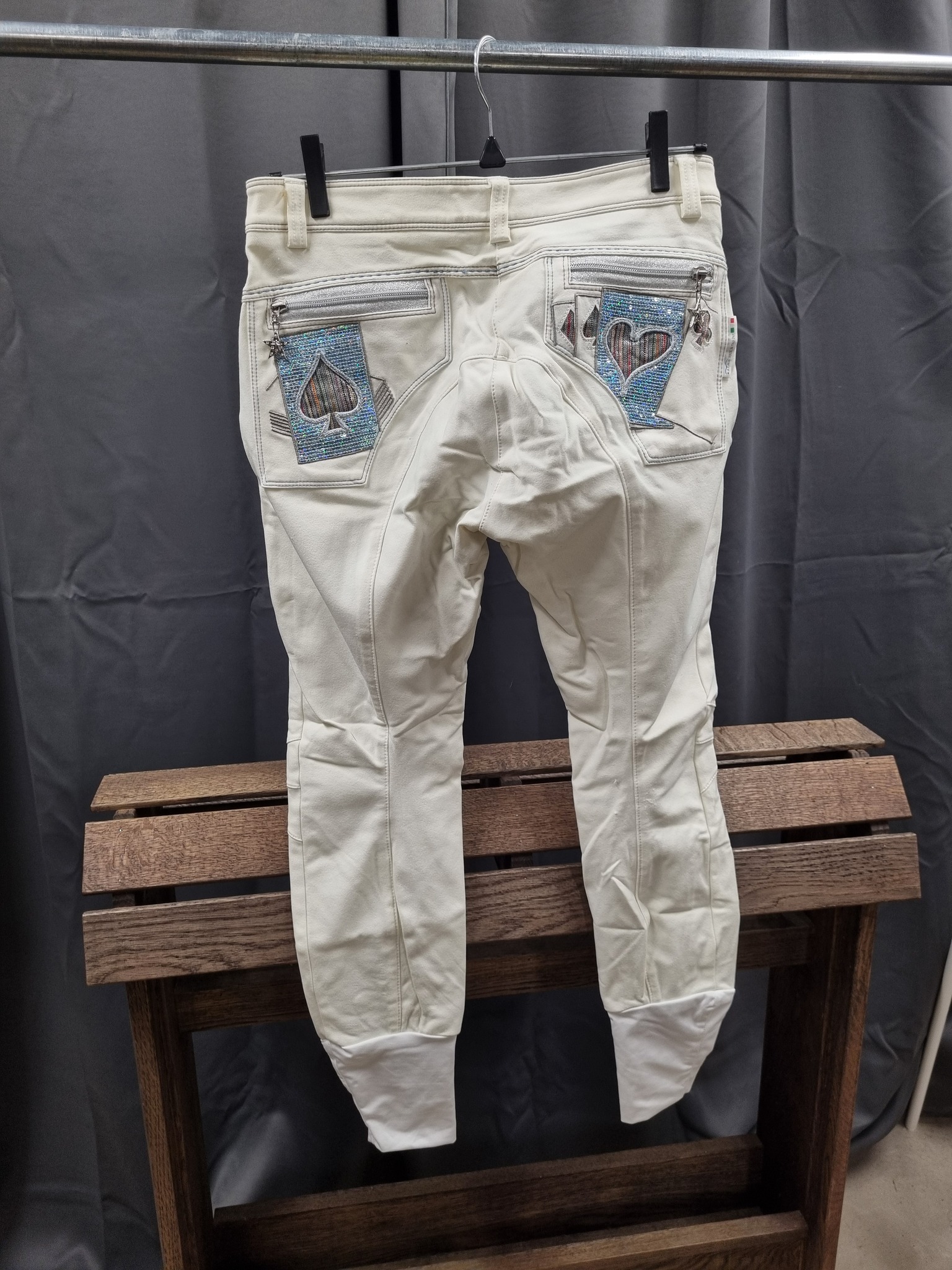 Begagnade ridbyxor från Animo i storlek 40, italiensk 44. Oskodda, med elastiska benslut. Paljettprydda bakfickor med silverglittrande dragkedja, dragtapp i form av stjärna med bling. Toppskick!