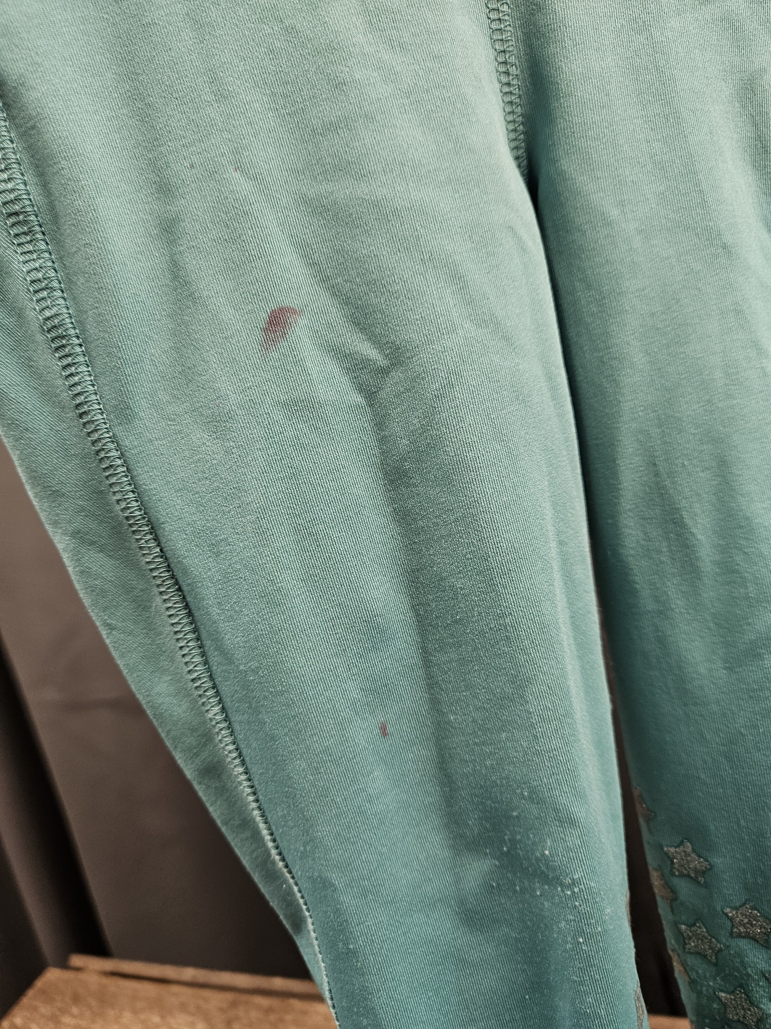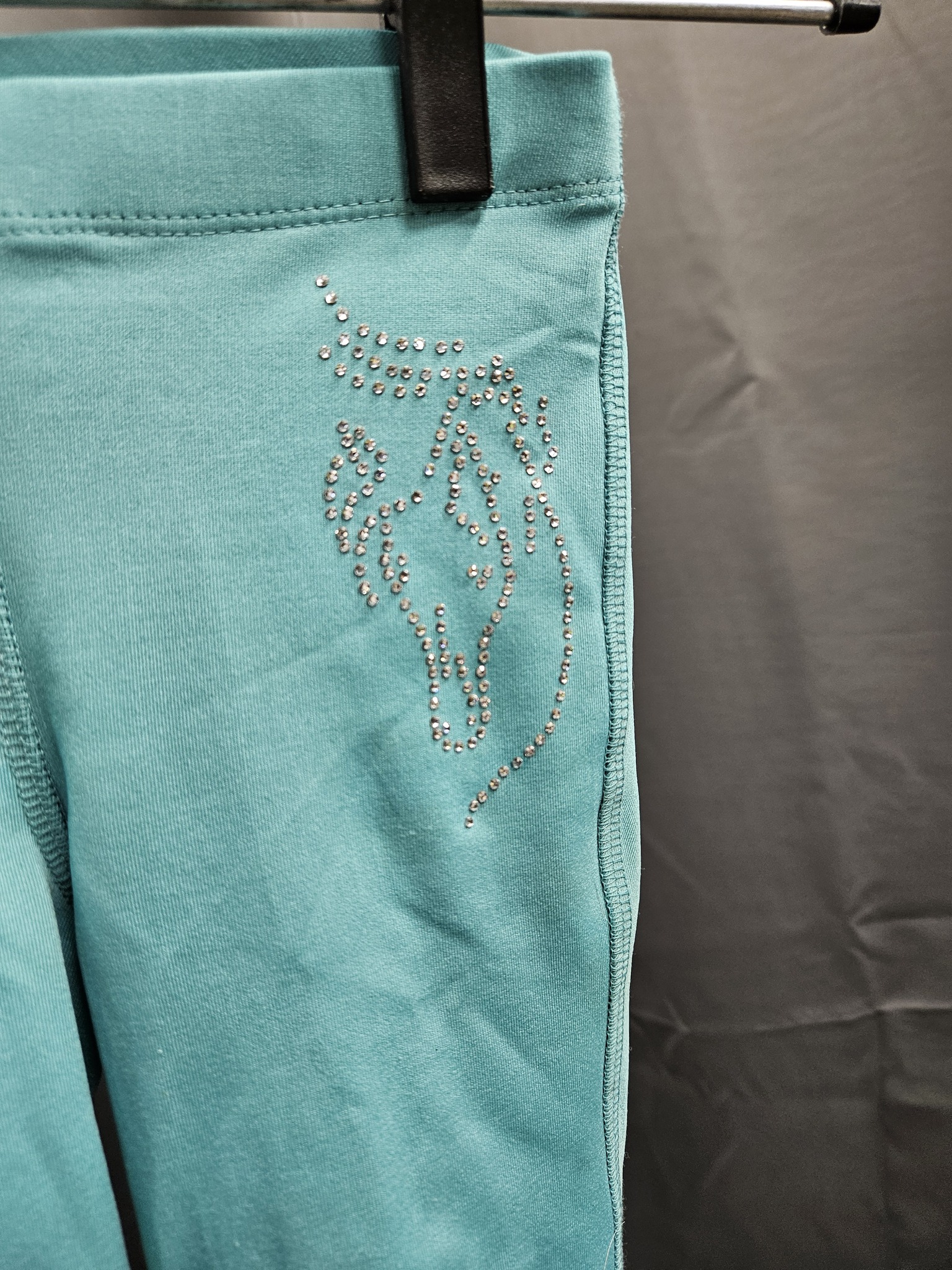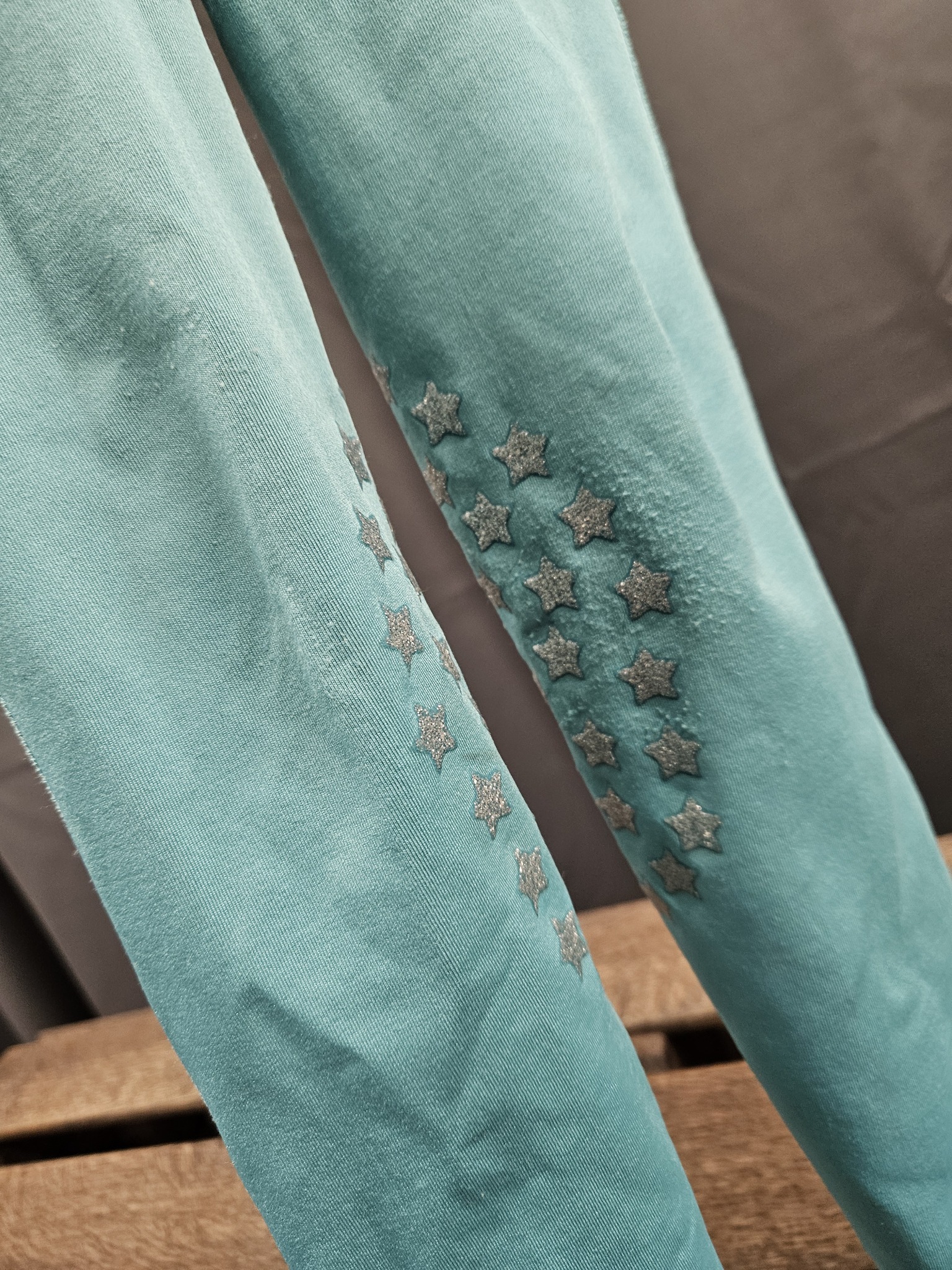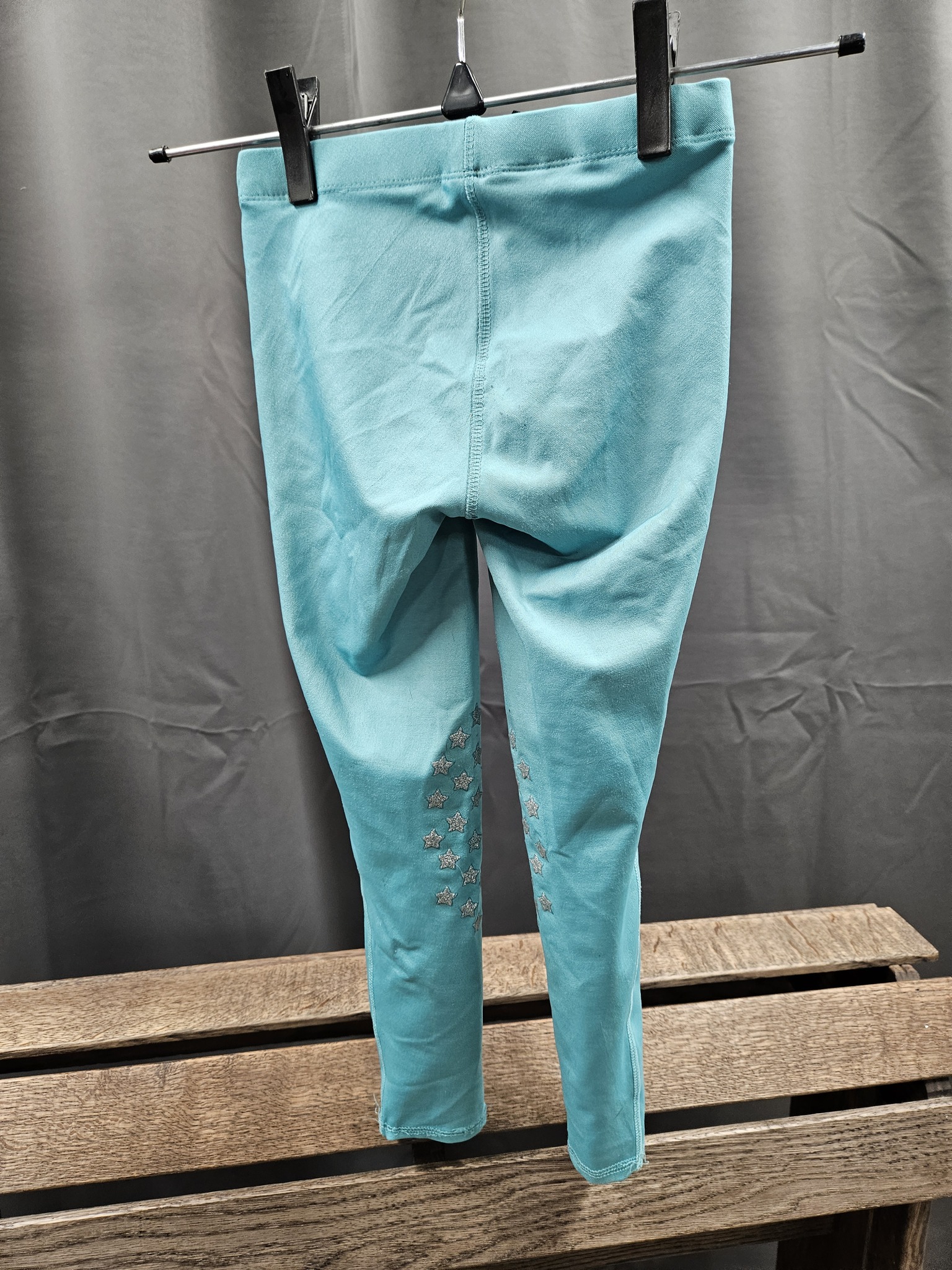 Begagnade ridleggings i storlek 120 cl från CRW. Tunna sommarridleggings med blingdetalj på höften. Knäskoning i silikon med glittriga stjärnor. Har två fläckar på ena benet.