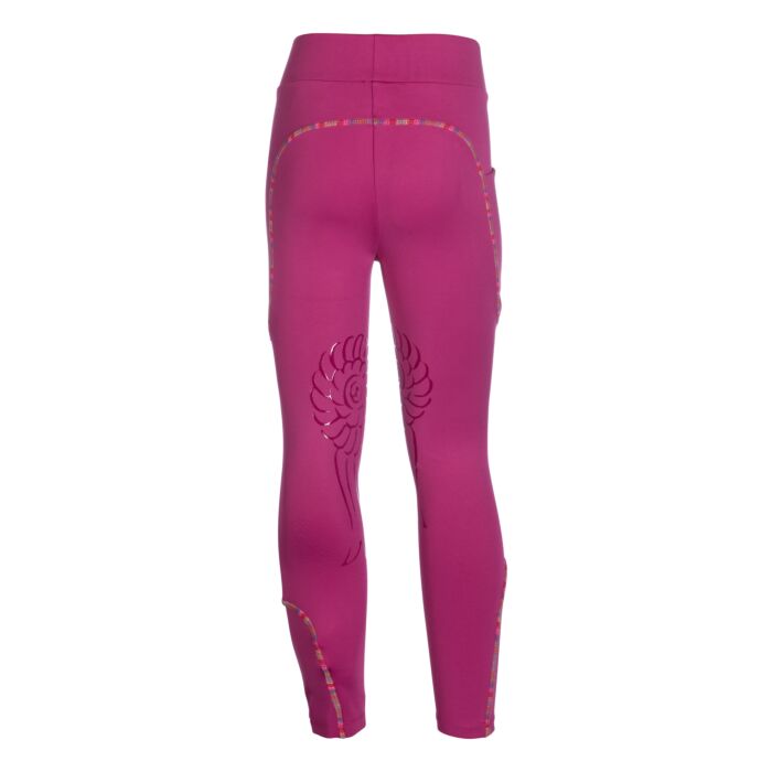 Ridleggings, HKM -Polly-Polly ridleggings för barn kombinerar funktionalitet med kärleksfull design. Knägreppet i silikon i form av en tävlingsrosett ger optimalt grepp i sadeln och ger leggingsen ett lekfullt utseende som kommer att glädja små ryttare. Tack vare materialet med 4-vägs stretch anpassar sig leggingsen perfekt till varje rörelse och säkerställer maximal komfort. Sidofickan erbjuder praktiskt förvaringsutrymme för små skatter eller en mobiltelefon, medan de flerfärgade sömmarna och ett litet hästmotiv ger söta accenter som hästfantaster kommer att älska.